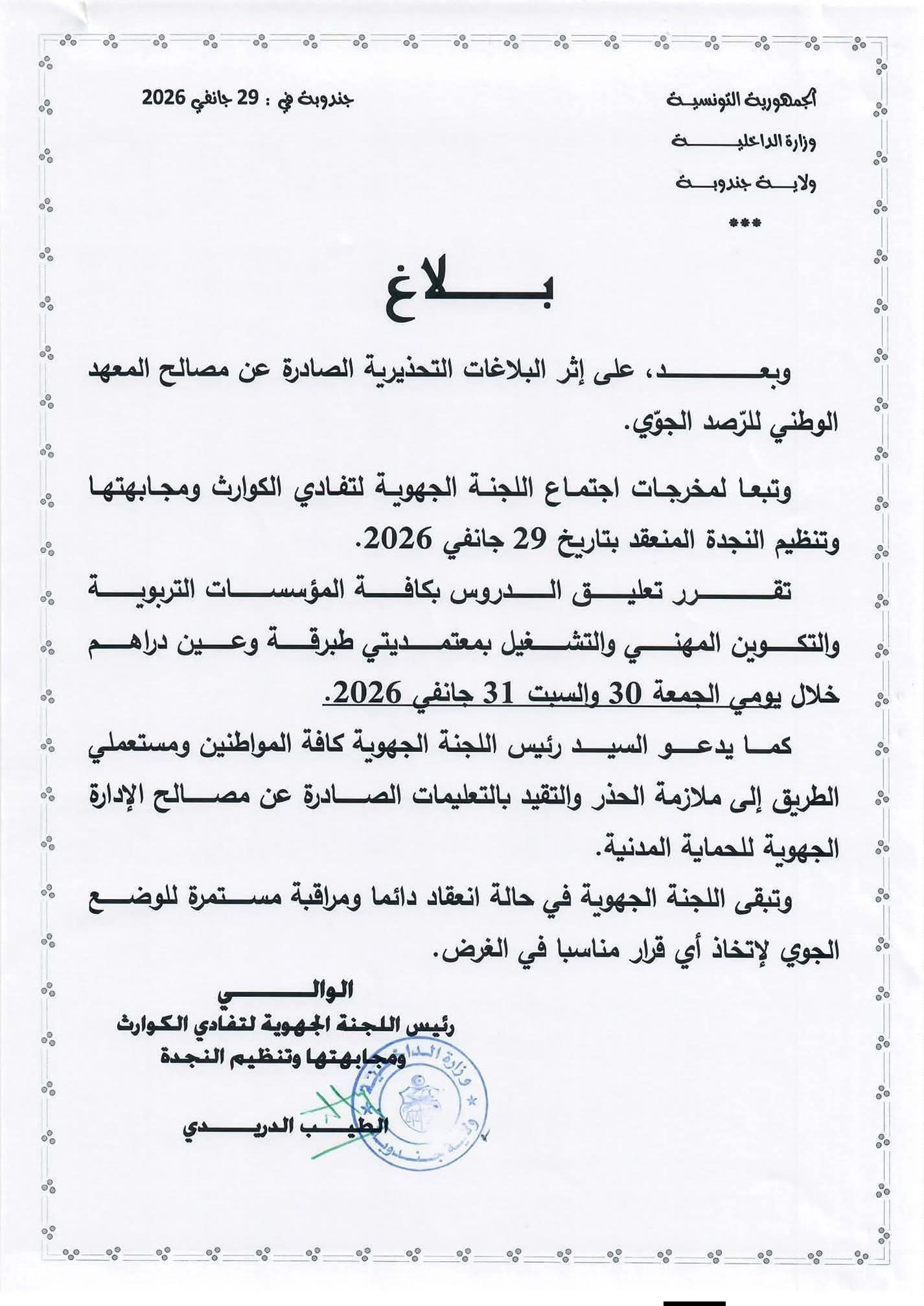 عاجل: تعليق الدروس غدًا الجمعة وبعد غد السبت بهذه المناطقبواسطة Admin / 29 يناير، 2026 عاجل: تعليق الدروس غدًا الجمعة وبعد غد السبت بهذه المناطق